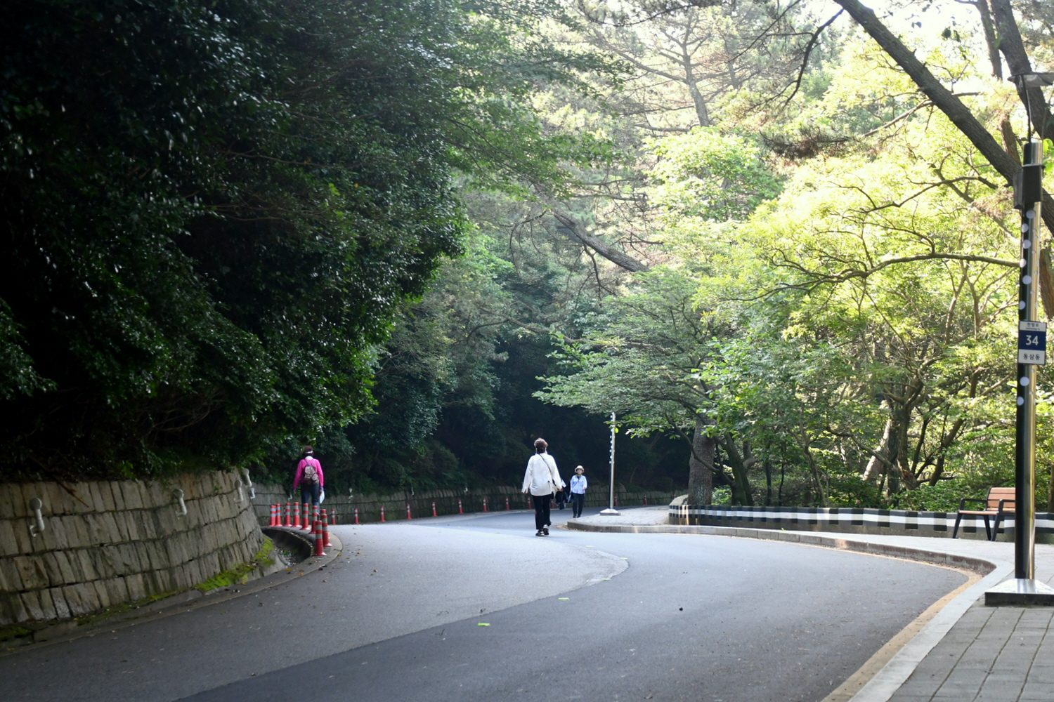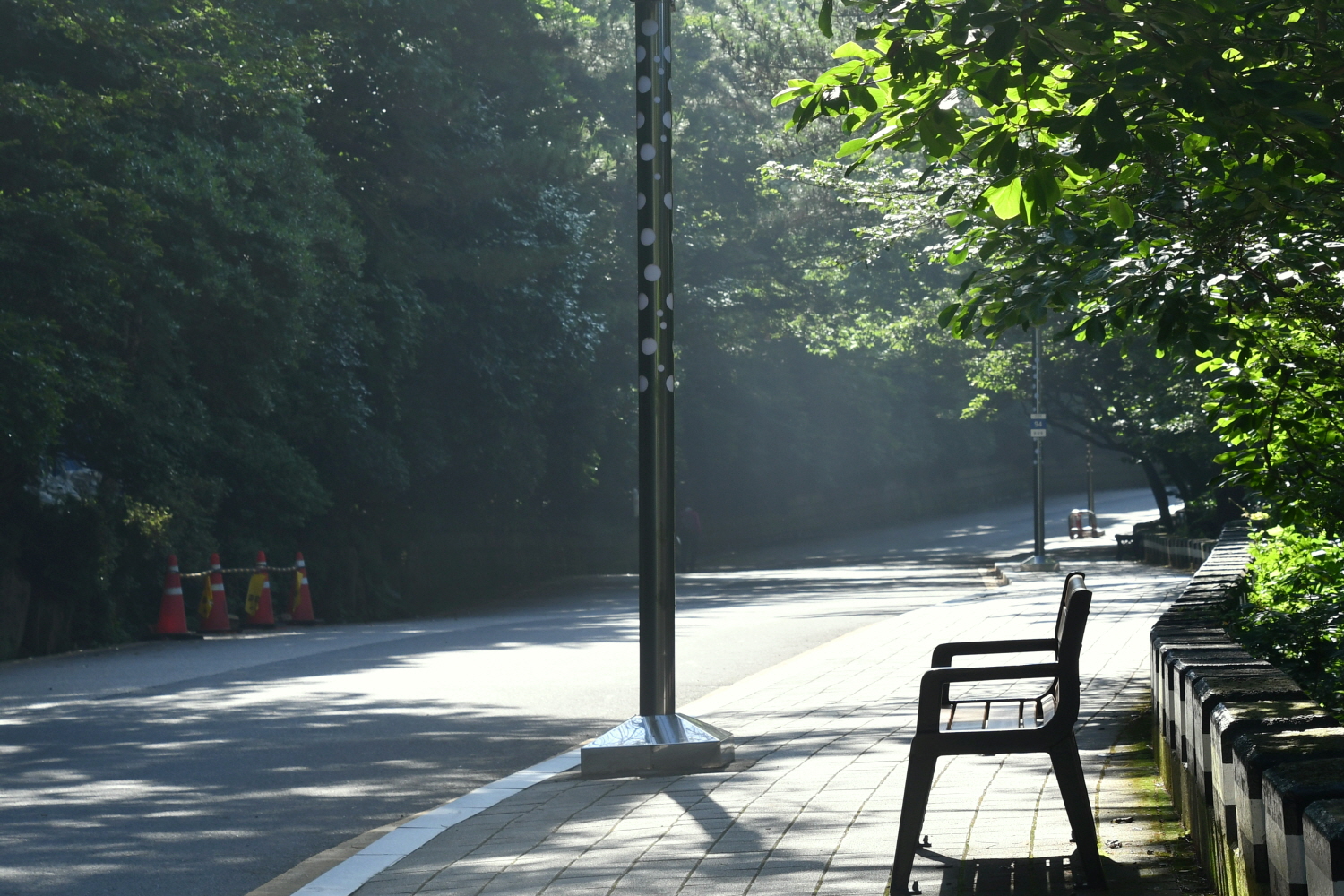 태종산의 여름은 부옇게 해무가 서린 날이 많지만 이날 아침은 울창한 가로수 터널 안으로 햇살이 들어오는 아주 청명한 날입니다.