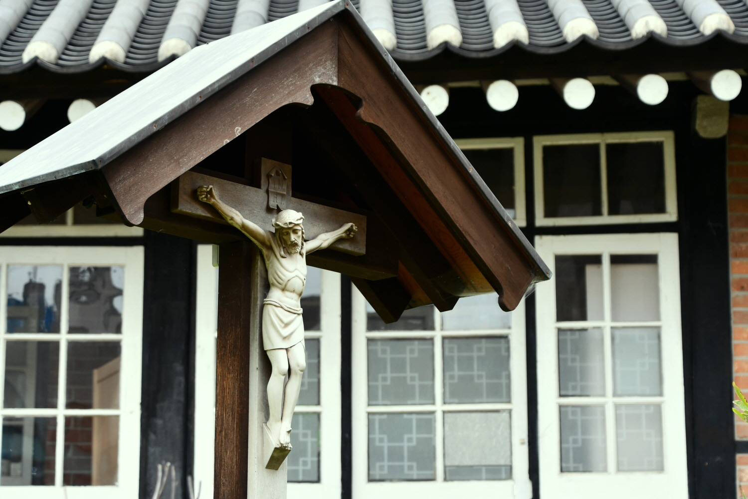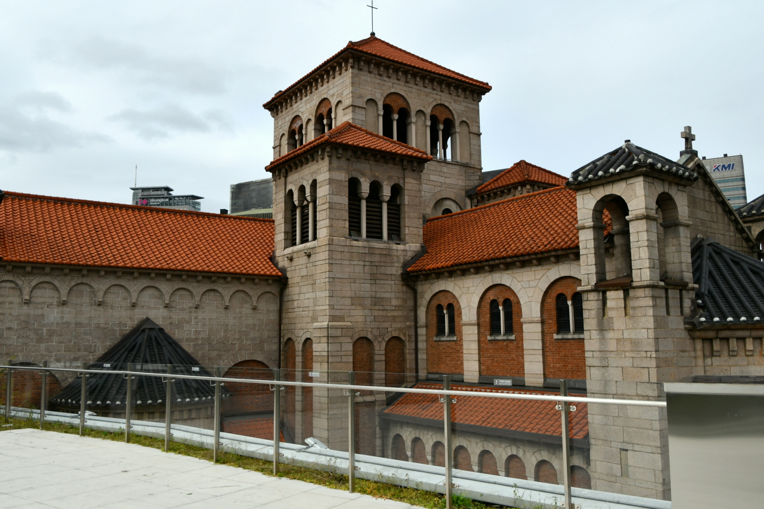 저 뒤쪽 담장 너머로 곧 내가 걸어갈 성공회 성당의 주황색 지붕이 보인다.
